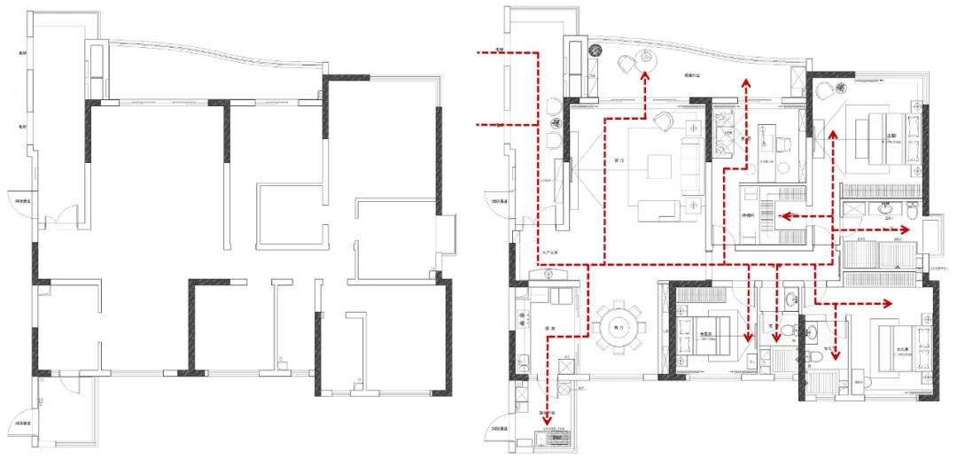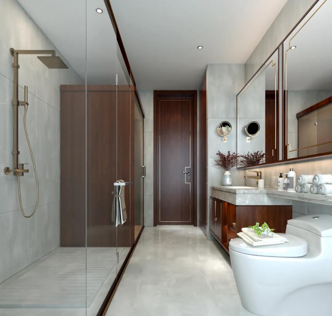 主臥床頭山水畫再次點明新中式主題,深棕色墻面與白色墻面中和,厚重也不失飄逸。無主燈設計讓室內光線更加柔和,主人在此休息睡眠體驗更好。衛生間做干濕分離,便于保持清潔,淋浴室做防滑設計,小細節很重要。