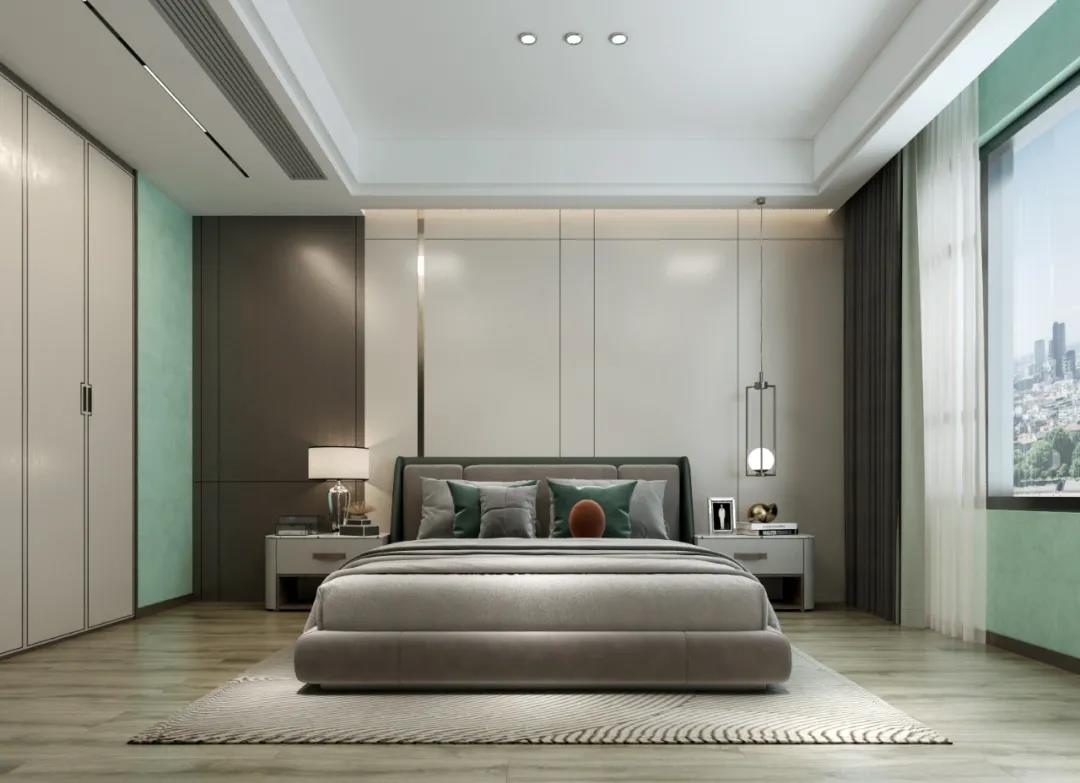 臥室整體去除復雜的設計元素,精準提煉最能表達風格的顏色,以灰綠、灰白、米色等低飽和度的色調進行搭配,打造出素雅簡潔、又頗有中式風韻的休憩空間。