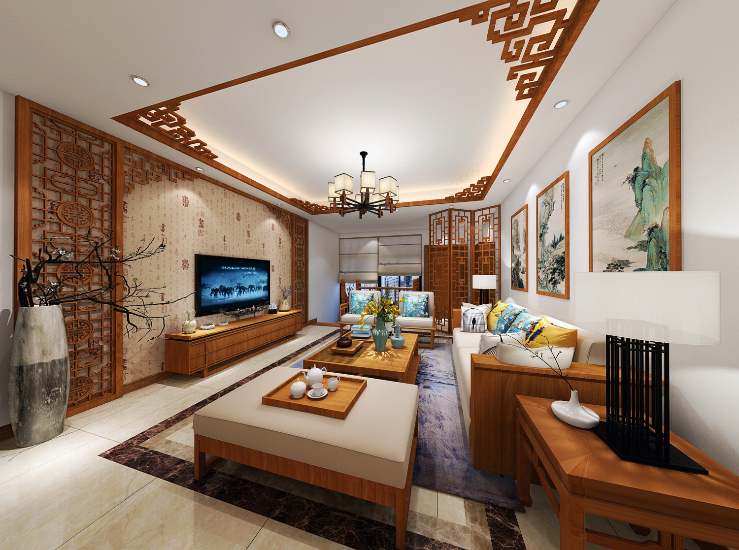 ● 戶型面積:110㎡ ● 設計風格:新中式 ● 整體費用:20萬 效果欣賞 客廳 全景圖展示點擊 客廳 全景圖展示點擊