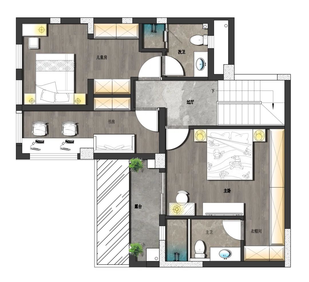 為滿足屋主三世同堂的需求,設計師選擇現澆二樓作為主臥的使用,整面墻的衣柜滿足儲存需求,并按照屋主家里老人居住的需求,將1樓單獨做出老人房的空間,現代風格致力打造三世同堂的理想家居。