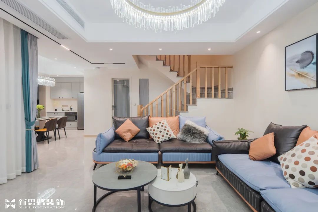 整個空間以溫潤的顏色為基底,輔以材質與顏色的碰撞,光線與空間互動,營造出簡約優雅現代格調,空間是光影的容器,進入客廳區域后迎向大面的南向采光,光線透過窗緩緩進入室內,在柔光輕撫下迎接日常的序幕。挑高的空間立體層次,使行走其中的動線更加自由靈活。