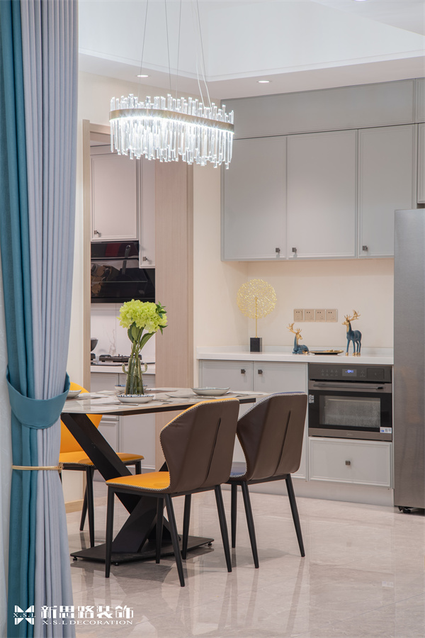 餐廳延續了整體空間的主色調和線條美感,大理石餐桌蓄意帶來一種自然的藝術氛圍,在原有的沉穩柔和中注入新的活力,素色的皮革餐椅打造出舒適的觸感。讓人全情地投入生活,熱愛生活中一食一飲的歡愉。客廳與餐廳開放式相連,整體色調素雅大氣,將抽象的自然意象,化為簡約的視覺符號;背景墻面的藝術裝置,擁有琥珀色的溫暖氣息,帶來多維度的層次感;樸素、自然、溫暖,設計師以現代藝術演變空間圖案,讓人不經意間,總能感受到時間的沉淀。