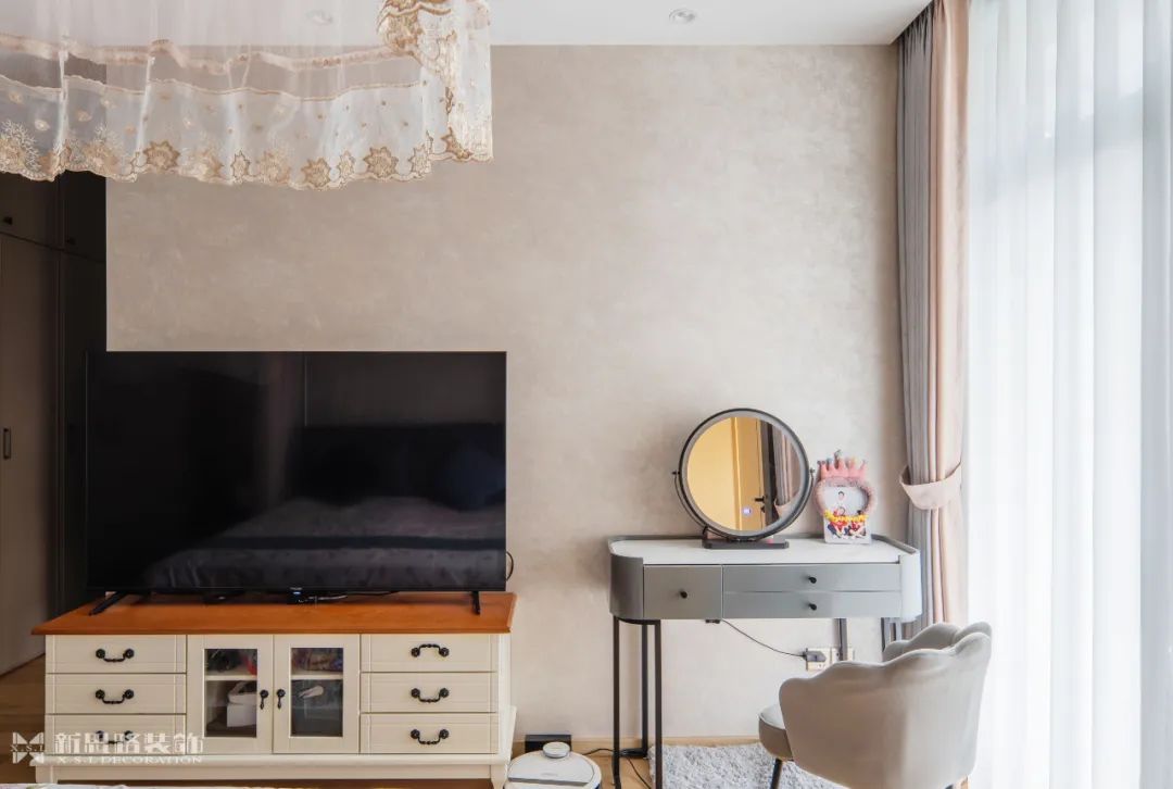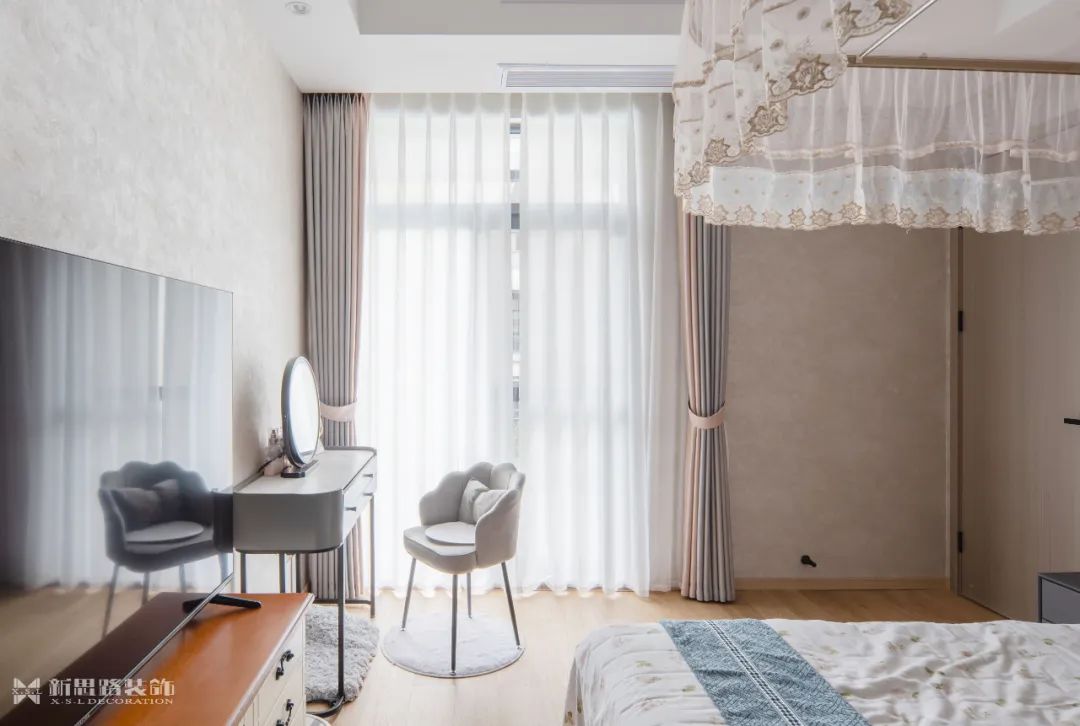 主臥的氛圍在柔和的線條中趨于平靜,皮革與布藝的使用柔化了空間的表情,讓人倍感放松。每當清晨,光線透過窗戶傾瀉而入,家便擁有了新的心跳,每一寸空間都隨著光影的移動而逐漸蘇醒。