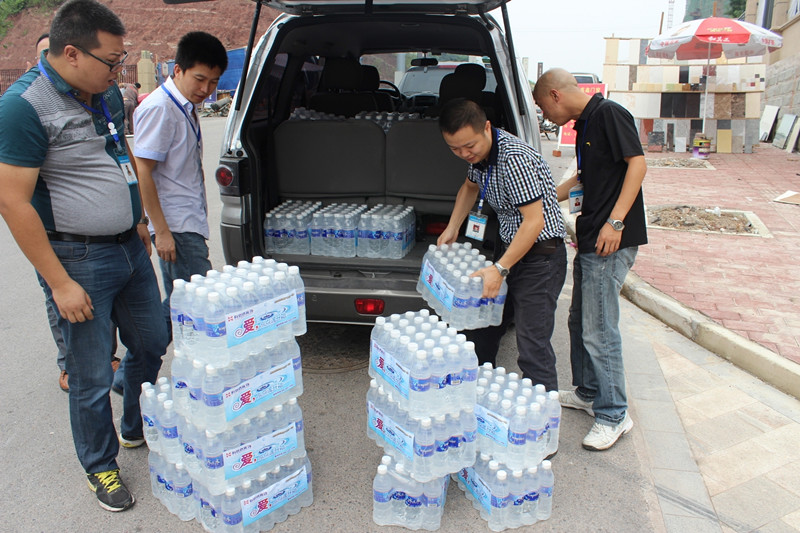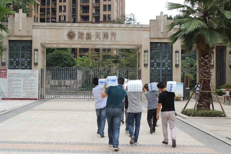 風塵仆仆,慰問成員扛著水向隆鑫天雨方進發