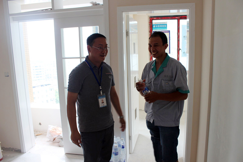 在送水之余,工程部文經理和南坪店楊店長還細心地跟業主交流施工細節
