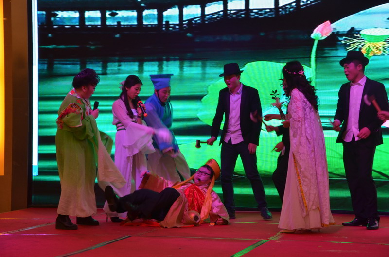 接下來的節目演出立刻讓晚會現場成為歡樂的殿堂。歌曲、舞蹈、小品、合唱多種節目形式,精彩紛呈,所有節目均為公司員工自編、自導、自演,充分反映出新思路裝飾生動而富有內涵的企業文化。繽彩紛呈、風格各異的十幾個節目贏得觀眾滿堂喝彩,充分展現出新思路家人多才多藝、能歌善舞的一面。熱鬧喜慶的《拜新年》作為開場第一個節目閃亮登場,歡快的舞蹈、喜慶的旋律、愉悅的氛圍感染著每一位在場的觀眾,為整場晚會點燃激情。活力奔放的串燒舞蹈《小蘋果》引起現場尖叫聲不斷;工程部家人帶來的歌曲《超越夢想》以大合唱的形式唱響了新思路人超越夢想、勇攀高峰的激情和心聲;性感柔美的歌伴舞《萬水千山總是情》更是引得場下“粉絲”陣陣尖叫。要說全場最閃亮的舞蹈,當屬才女徐藝丹帶來的獨舞《映山紅》,優美的舞姿訴說著無盡的情思,散發著醉人的芳香,看得人是如癡如醉。而江北店家人帶來的小品《招聘》延續去年的爆笑風格,幽默的臺詞,惟妙惟肖的模仿讓現場笑聲連連,掌聲不斷。還有南坪店家人表演的小品《新白娘子傳奇》、工程部家人帶來的情景劇《交房》、沙坪壩店家人帶來的對唱《有你有我》、江北店家人表演的相聲《回家》......家人們以業余的身份發揮出了專業演員的水平,把角色演繹得惟妙惟肖,讓人嘆為觀止。