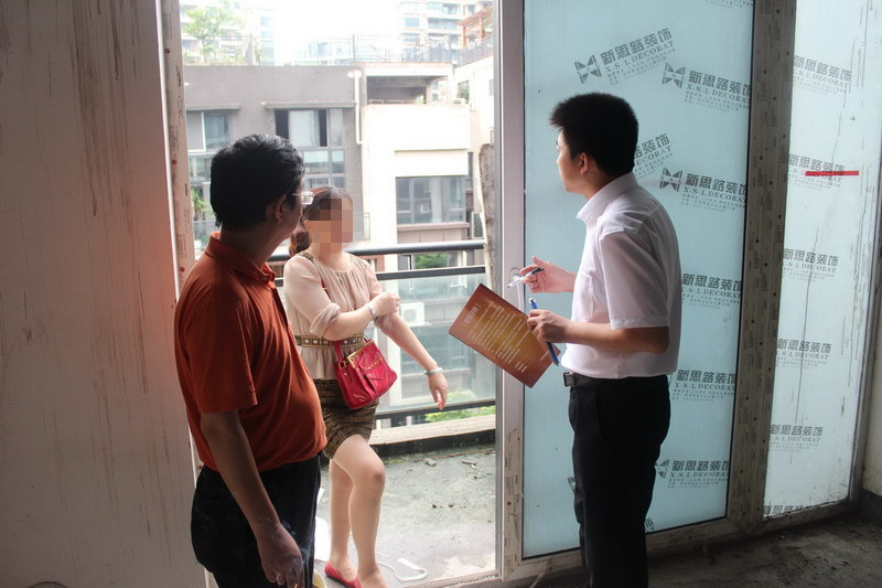 質(zhì)檢正在向潘老師夫婦介紹公司施工管理和服務的標準。新思路裝飾一直堅持“客戶滿意是唯一的工作標準”,努力踐行“裝修做客戶口碑”的理念,致力為每一位客戶提供高品質(zhì)的工程質(zhì)量和裝修服務。