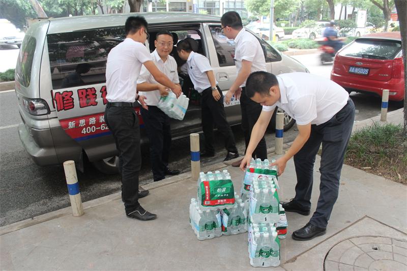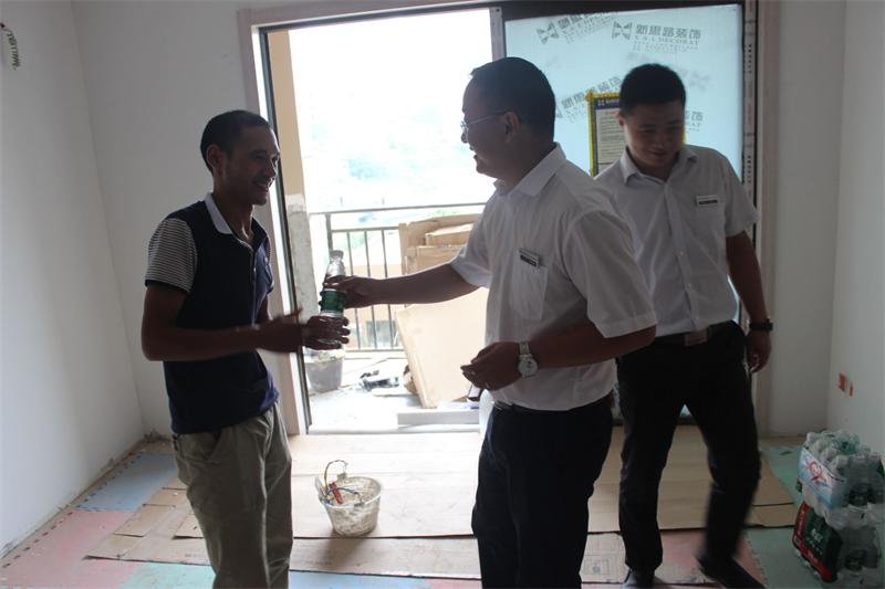 時下已是8月下旬,但山城氣溫依舊高居不下。炎炎夏日,驕陽似火,正是公司各施工工地趕工期、保品質的黃金時期。為了做好夏季防暑降溫工作,確保廣大一線員工的身心健康和安全,8月26日,新思路裝飾“2015夏季送清涼”活動正式啟動,以工程部、南坪店、北紅星店等部門組成的慰問小組,帶著藿香正氣水、礦泉水等防暑降溫物品,深入到工地施工一線,親切慰問在高溫下奮戰的工人師傅們,給他們送去了公司的關懷和絲絲清涼。