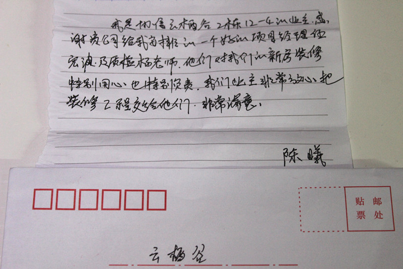 小小的一封感謝信,代表著客戶對新思路裝修品質的巨大認可,也凝聚著所有新思路人“做一個工地,就做成一個樣板”的努力和心血。感謝客戶的信賴和支持,我們將以此為動力,全新全意做客戶品質,打造出更多的“精品工程”、“樣板工程”,來回報我們的客戶。