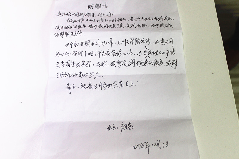 顏老師在信中表示:“由于本人長期在外地工作,無暇兼顧裝修,在貴公司的悉心管理下順利完成裝修工作。貴公司專業的裝修團隊,提供優質的服務,裝修期間王經理認真負責,質檢定期巡查工地,保證了工程質量。在此,感謝貴公司提供的裝修服務,感謝王經理的細心照應。”