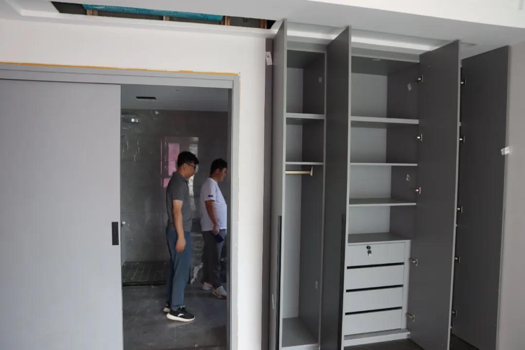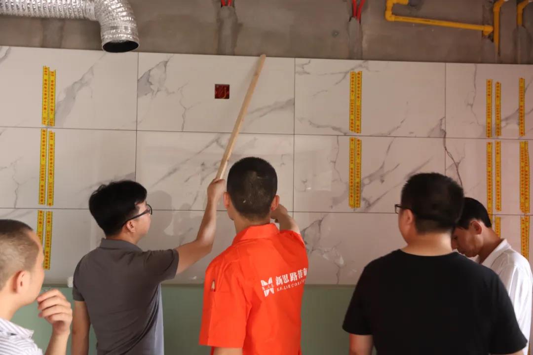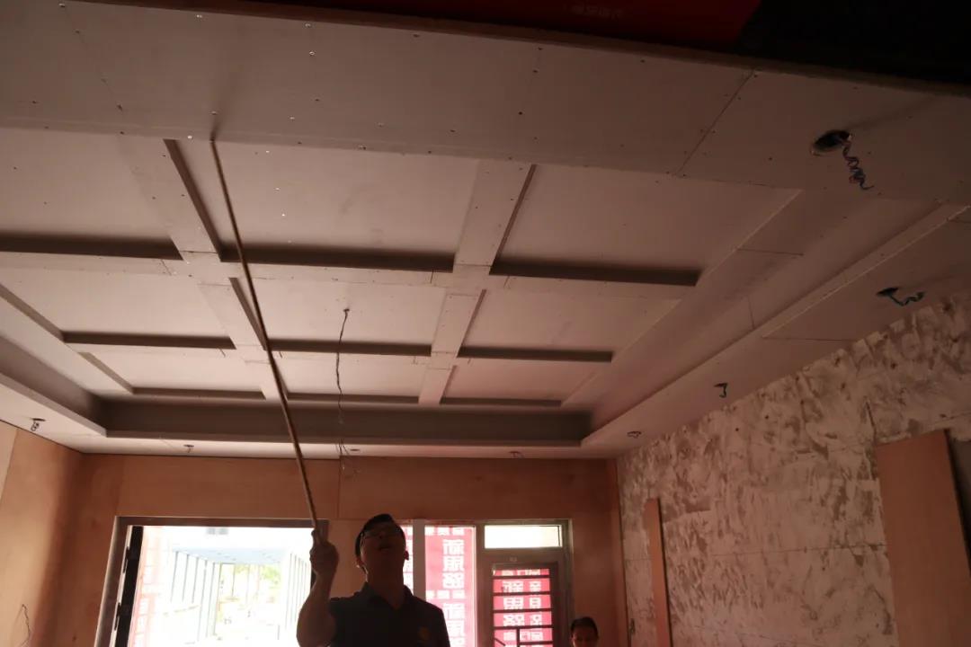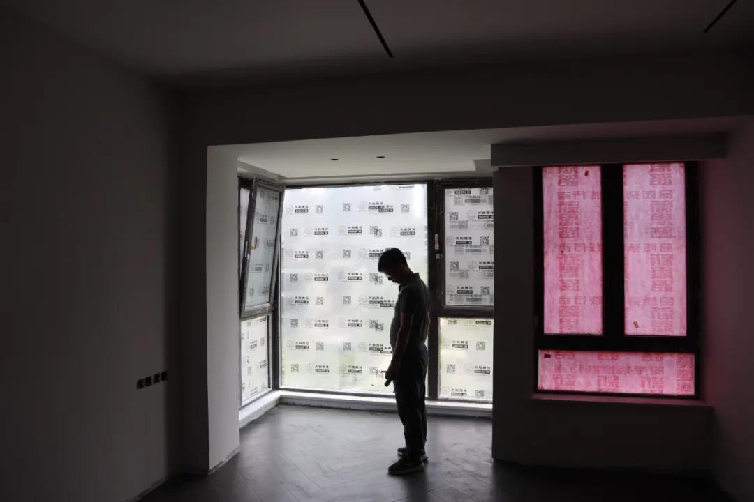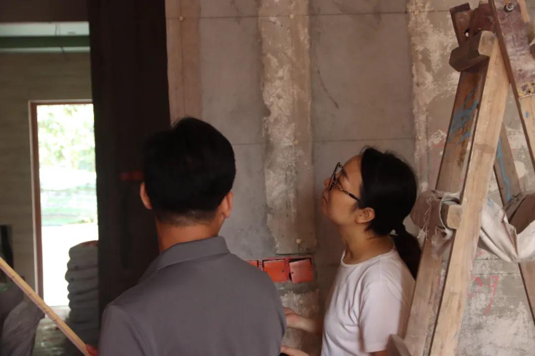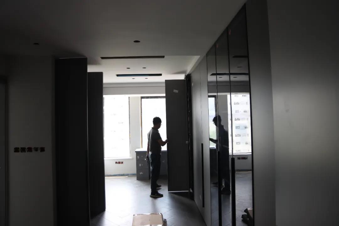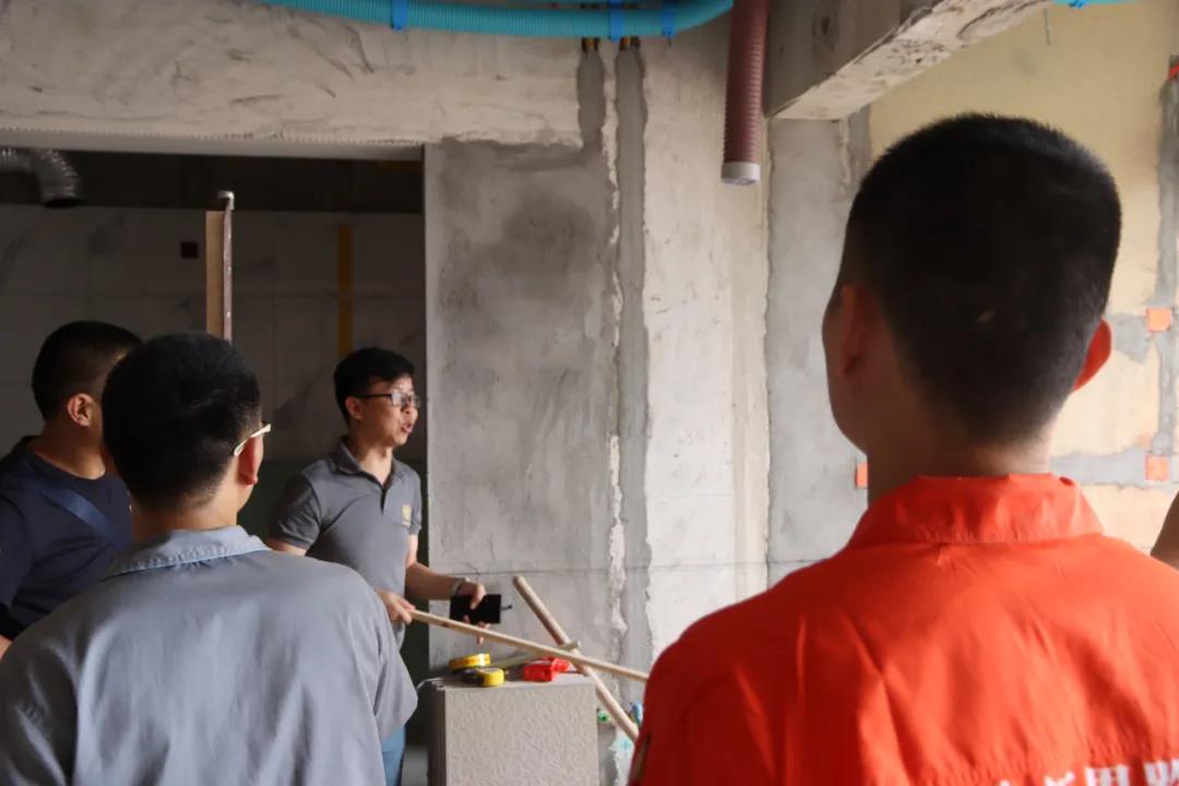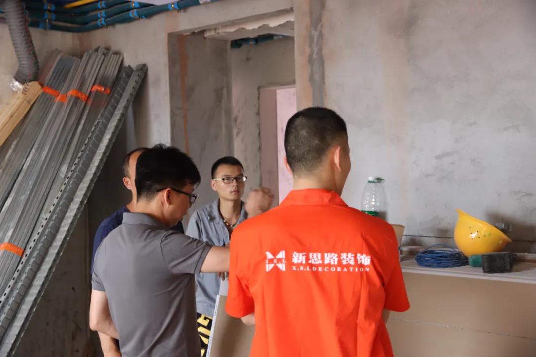 我們來到的第一處工地是水電階段剛結(jié)束、正在進行硬裝階段的工地。客戶正在工地上查看情況,設(shè)計師敖元壩剛到現(xiàn)場,就和我們在施工的工人以及在場的客戶交流起來。