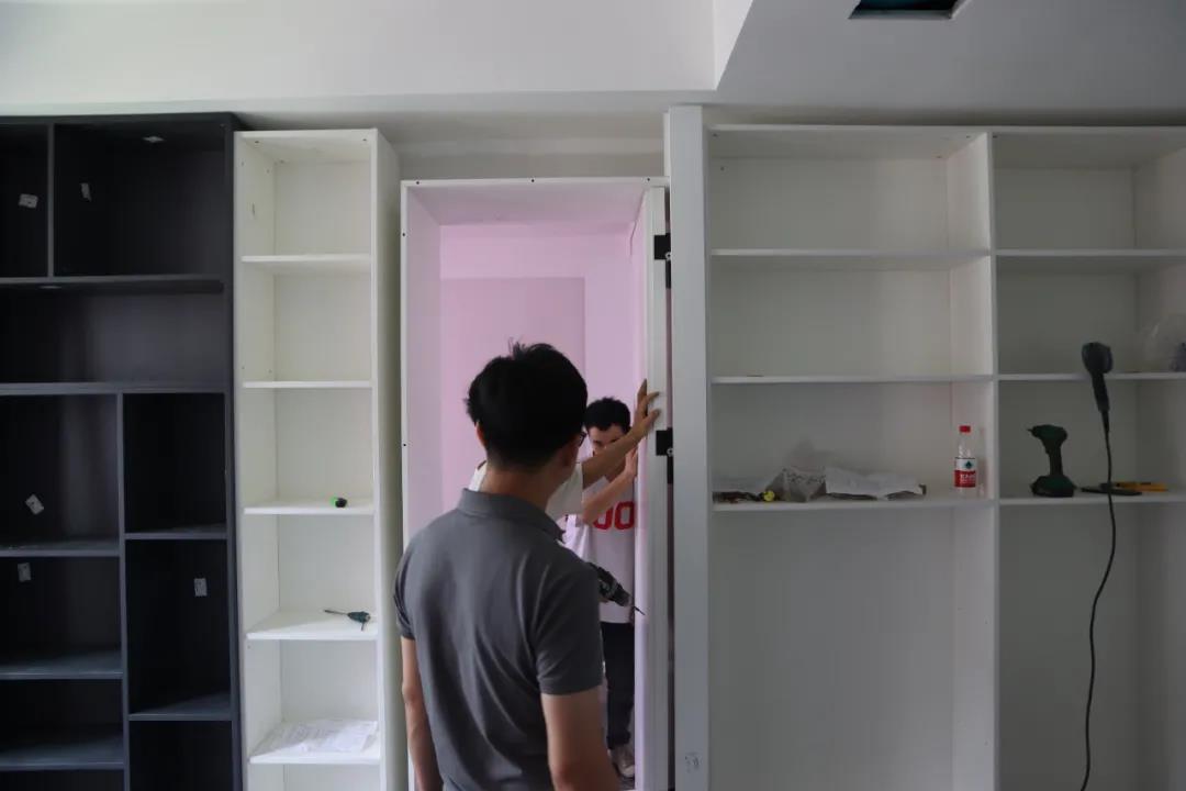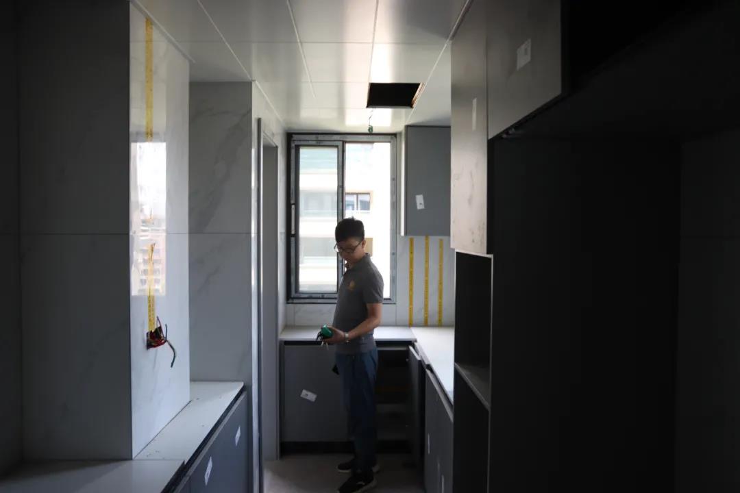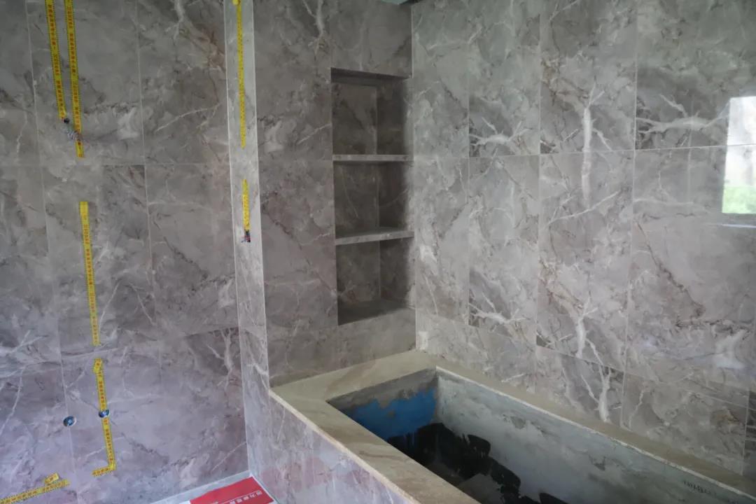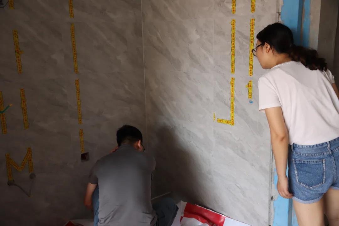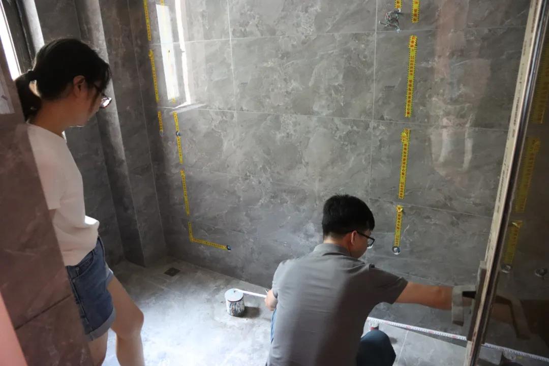 衛(wèi)生間瓷磚拼貼完成后,接下來就要準備上馬桶、臺盆、柜子等的安裝。衛(wèi)生間空間有限,各個物品的尺寸需要復(fù)核多遍,保證最后在安裝的時候能夠正好符合。為此,設(shè)計師敖元壩和業(yè)主再次對衛(wèi)生間的一些尺寸進行了測量。