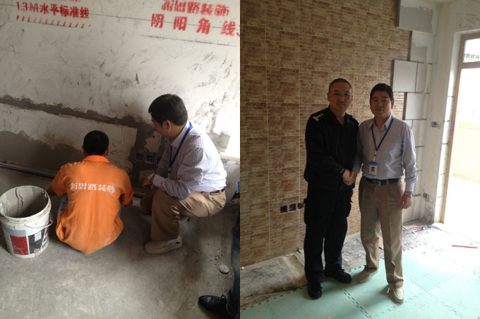 首先,我們來到位于沙坪壩濱江路的華宇金沙時代小區(qū)。到達(dá)施工現(xiàn)場正值漆工師傅緊張有序的施工,我們首先對泥作工藝進(jìn)行了查看,瓷磚的平整度、接縫差等一系列進(jìn)行了檢驗。張總就工藝細(xì)節(jié)與大家共同探討,并在現(xiàn)場提出工藝上的問題,大家都積極的回答。當(dāng)即張總指出,我們的每一位員工都要對我們的施工工藝清楚的了解到,并如實的告知客戶。這樣才是真正讓客戶明明白白裝修。